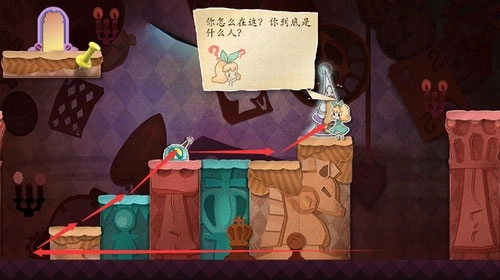 1、按照教学,将蓝色方块向左拖动,触发剧情和爱丽丝对话以后爱丽丝进入镜子里。