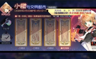 “小樱与交界都市”活动共分为两个阶段,第一阶段活动开放时间为4月3日更新后——4月24日7:00;第二阶段活动开放时间为4月13日7:00——4月24日7:00。第二阶段开启后,已完成第一阶段的指挥使大人将自动进入第二阶段活动。若届时指挥使大人仍未完成第一阶段,第二阶段将在指挥使完成第一阶段任务目标后自动开启。
