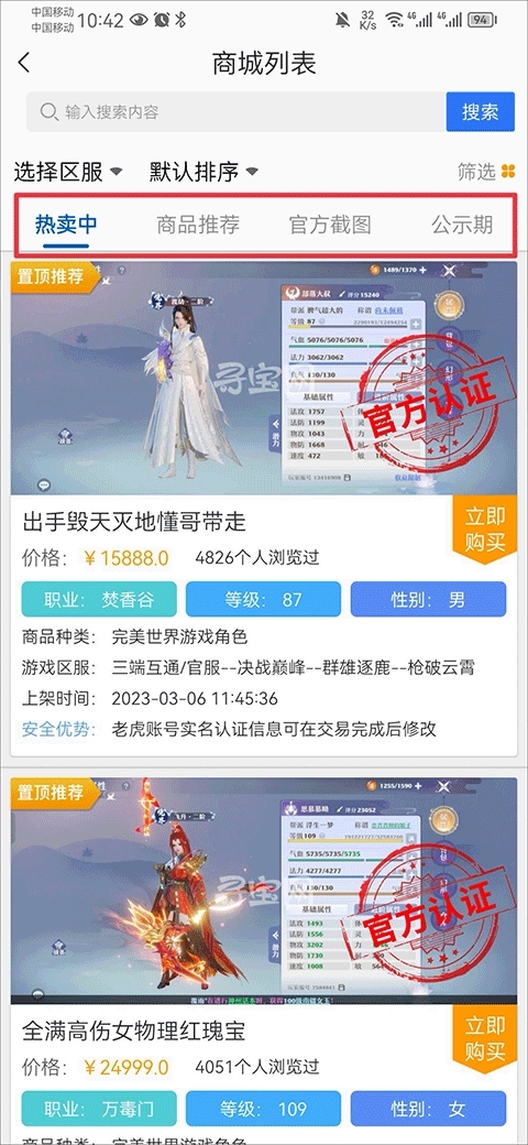 1、涵盖完美世界旗下全系列游戏的虚拟商品交易,能为玩家带来更便捷的购物体验,使玩家可随时选购心仪的商品。