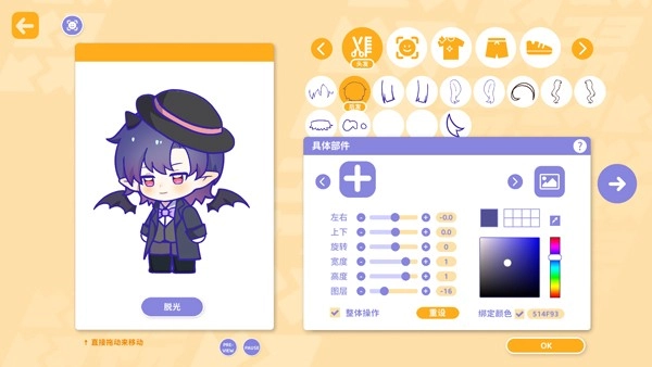1、高自由度捏人系统,精细还原推的角色,发型五官服装全自定义,言行随性格变化。
