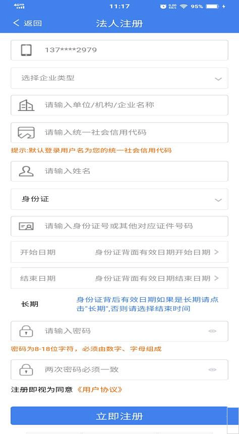 3、选企业类型,填企业名称、统一社会信用代码、法人姓名和身份证号,设密码。密码要符合要求,点"立即注册"。完成后登录办业务。