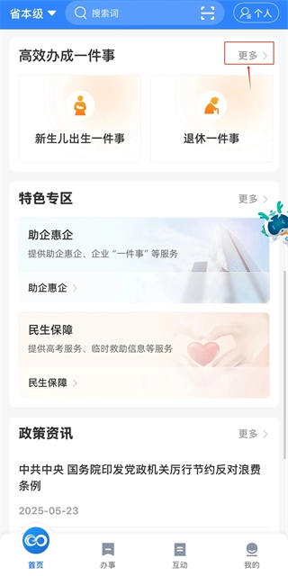 2、主界面下拉找【高效办成一件事】专区,点【更多】。