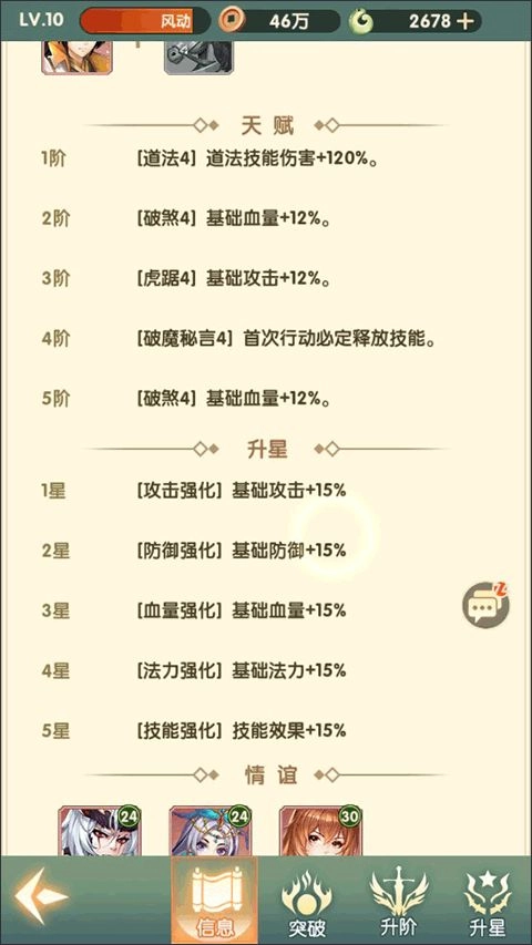 角色养成技巧:优先升星意儿,天赋阶阶满级再换将。材料省着用,别乱花仙玉。