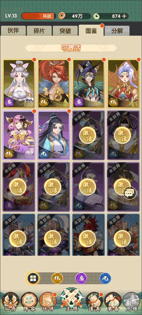 伙伴分仙、魔、凡三类,品质从N到UR。N和R卡容易抽到,适合前期过渡,UR卡最强但需合成获取。