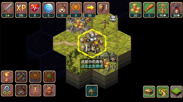 开局选择职业与难度后进入随机地图。每次移动消耗时间点数,六边形地块可能触发战斗或事件。右上角时钟显示距离下次恶魔袭击的剩余天数。