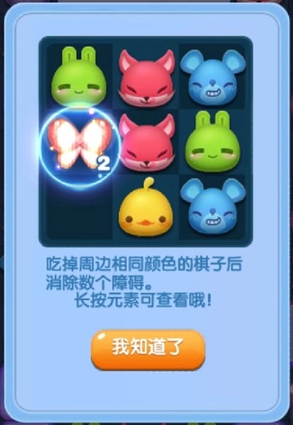 【元素介绍】想要获得小精灵般的蝴蝶可不是件容易的事,首先要有大局观念,注意观察全盘棋子的分布,因为蝴蝶的作用在于它可以吃掉周边相同颜色的棋子,周围颜色相同的棋子越多,那么消除的范围就会越大,飞舞的蝴蝶再吃掉相同颜色的棋子后,还可以随机消除数个障碍,可以说是挽救僵局的一大利器。