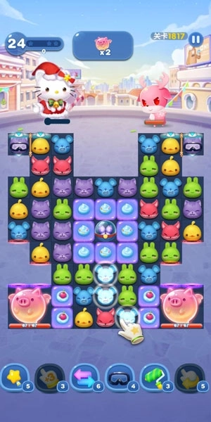 【难度解析】冒险模式的第1816关是新元素蝴蝶的首次亮相,接下来的1817关则是更加凸显了蝴蝶的重要性。百宝袋中的蝴蝶被果冻包围在中心,想要变出蝴蝶则需要消除果冻旁边的棋子,由于果冻位置居中,所以玩家们想要组成暴走幽灵或是炸弹等特殊棋子还是有一定难度的。因此先从最基础的消除方式开始,紧靠果冻来进行棋子的消除,这种游戏策略在一定程度上巧妙转化了游戏的消除方式,大大简化了消除的成本,相当于节省了步数。消除完百宝袋周围的果冻后,便可以通过蝴蝶来攻击精灵猪和它的分身,从而提升通关的成功率。