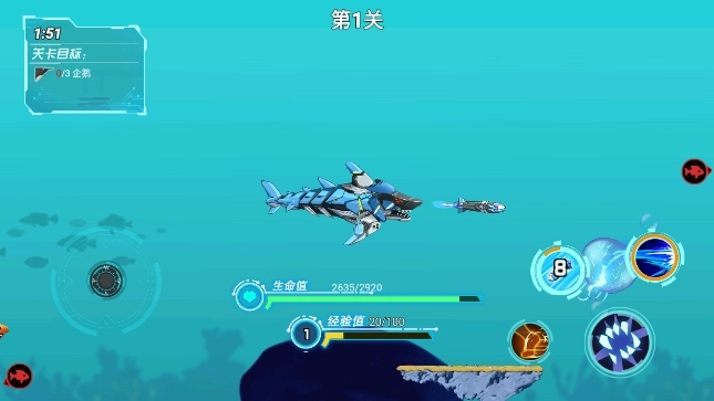 2、 收集宝藏与各类道具,以此提升机械鲨鱼的等级并增强其能力。