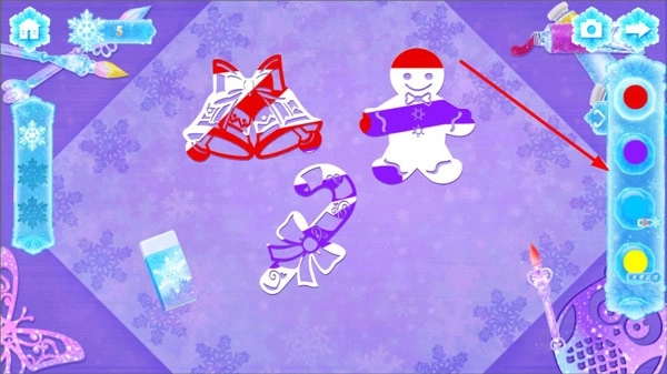 3、进入花式填色玩法页面,玩家需要给装饰品填涂上颜色,根据手指指示移动右侧颜色填到装饰品上面,保存即可。