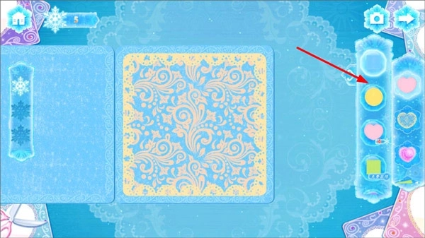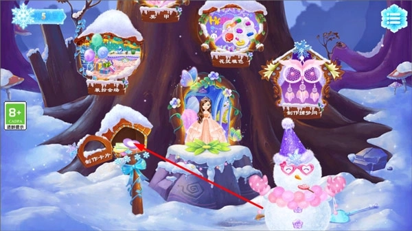 1、打开莉比小公主之冰雪派对游戏,进入主页,主页有堆雪人、制作捕梦网、美甲、装扮会场等玩法,点击制作卡片;