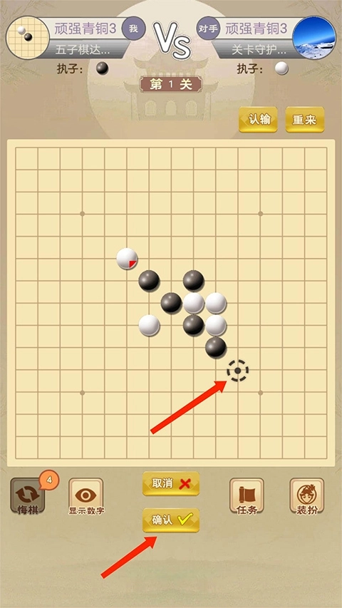 3、在棋盘上点击需要落子的点会出现【瞄准】图标,选择下方【确认】即可落子,