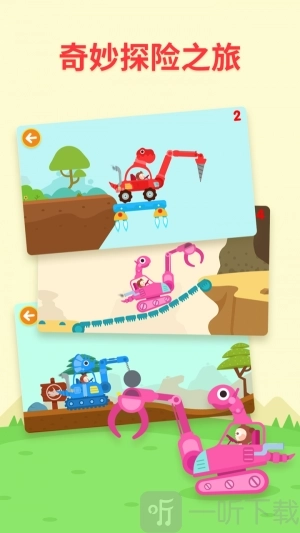 3.赛车游戏设有多样的关卡,专为儿童打造的三款恐龙机械车也各具独特之处;