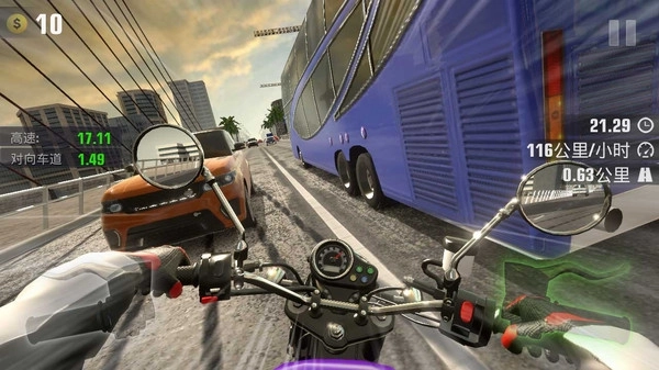 最经典的快速超车玩法;生涯、无尽、计时三种模式,任意选择;拟真的摩托车第一人称驾驶;UE4极限画质建模,体验最真实的摩托细节;
