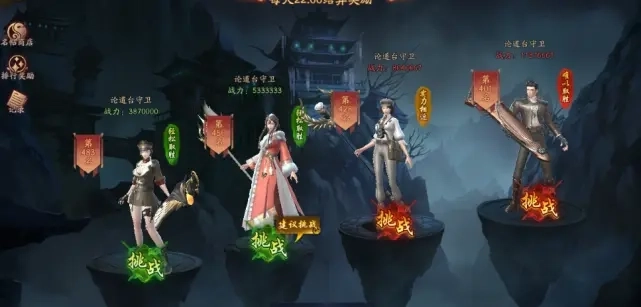 5、论道台,每天有10次免费挑战奖励次数,(VIP可购买额外挑战奖励次数,10银锭一次,次数一定要买满哦!)条件允许的道友们可以通过不断挑战获得更高的排名和名帖积分,赢取背饰化形、宝石、背饰精华等奖励。(注意:挑战而不是扫荡,挑战给的经验是扫荡的2倍多哦!)