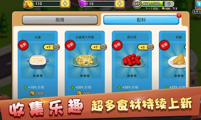 游戏中把每个区域的解锁,通过关卡的形式来呈现,并且可以在一定的关卡中获得不一样的料理配方!