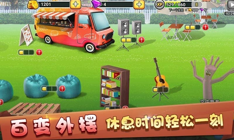 这部作品中的环境设计更是别具一格,玩家要通过游戏赚取到一定的金钱,只有这样才能购买获得更多的装饰,玩家要布置餐车周围的场景并打造出别样风情的画面,游戏中为你设计出了完善的经营元素,你需要按照顾客的要求制作出各式各样的食物,食材的搭配不同你做出来的料理也是不同的。