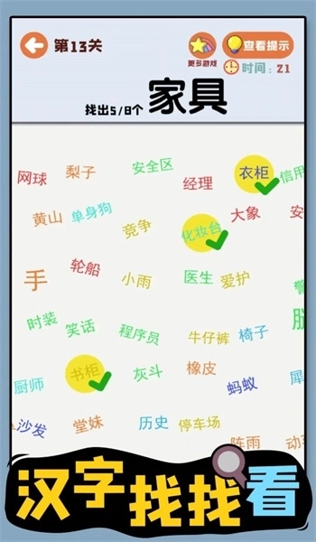 《汉字找找看》游戏特色: