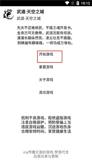 武道天空之城最新版是一款纯文字武侠放置类游戏,凭借简洁画风、纯文字剧情与放置玩法,为玩家构建出一个全新的武道世界。游戏玩法十分简单易上手,玩家开局选定天赋后,即可自由打坐或挂机升级。不过要注意,不同天赋各有特点,也会让玩家收获不一样的成就。尽管操作简单,但游戏内容相当丰富,装备、武门、坊市、打造、江湖、副本、地图等多样系统,能为玩家带来多姿多彩的武道修炼体验。