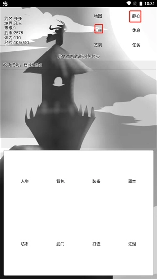 2、打坐与静心皆为重要的经验获取途径,每日完成签到及任务均可获得武币。