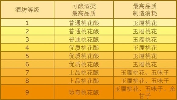 丹炉、酒坊、药臼、茶釜均分为9个等级,等级越高,可制造的对应消耗品品级越高。