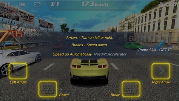 3、进入关卡后,可点击左右两侧的按钮来实现拐弯操作,屏幕下方的按钮则是刹车键(悄悄透露个小技巧:同时按下拐弯和刹车按钮就能触发漂移,这招在弯道超车时特别好用,赶紧去体验一下吧);