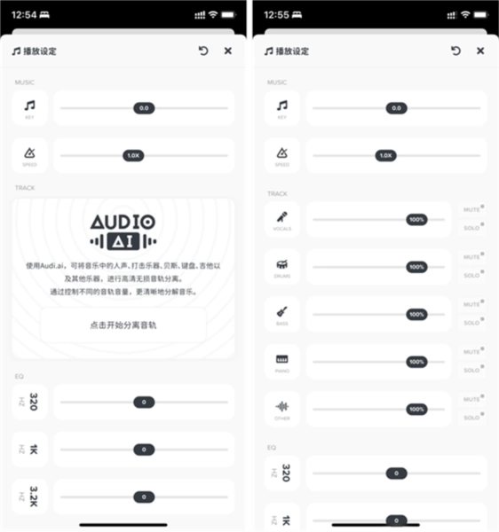 4、若要对当前播放的音乐进行音轨分离,需点击界面右上方的「播放设定」选项。在该菜单的「TRACK」分类下,可找到「AUDIO AI」功能——借助人工智能技术,此功能能更高效地分离不同乐器的音轨。点击该功能后,系统会将音频文件上传至云端进行智能分析,分析完成后,生成的多个独立音轨将自动下载至本地,从而完成音轨分离操作。
