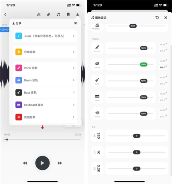 可以从任意歌曲里,把人声、鼓、贝斯、键盘钢琴、吉他以及其他乐器的轨道分离开来,而且还能对分离后的各音轨音量进行调整。