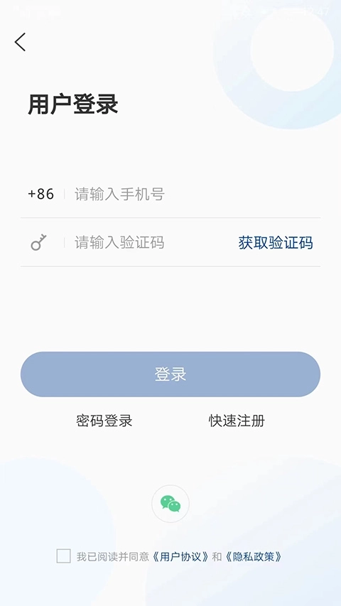 2、进入用户登录界面后,可通过输入个人手机号与验证码,或直接使用微信号完成登录;若用户暂无账号,通过手机号登录后系统将自动完成注册。
