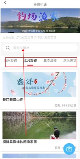 4、里面有各种类型的钓场推荐,我们还可以点击搜索框查找钓场