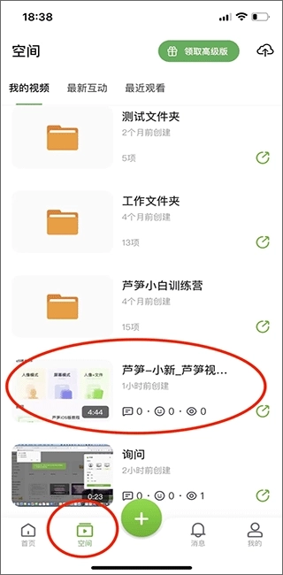 1、芦笋所录制好的视频全部都会自动存储在云端,不占用本地内存,如需下载到本地可以打开app,进入到【空间】页,找到需要下载的录屏文件;
