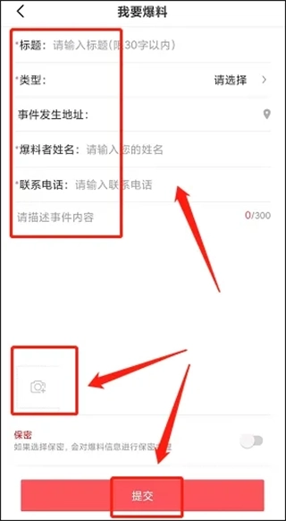4、进入“我要爆料”界面后,依次填写爆料标题、选择爆料类型、填写事件发生地址、爆料者姓名及联系方式、描述相关时间,并上传图片,最后点击【提交】按钮即可。