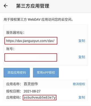 ●最后回到百灵创作的操作,在WebDAV的配置弹窗里,找到对应的位置分别填入“服务器地址”“账号”以及“应用密码”就可以了。