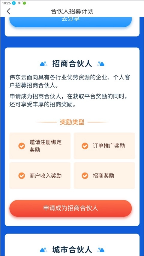 申请成为城市合伙人,即可解锁更高比例的平台奖励,并延长获取奖励的期限。