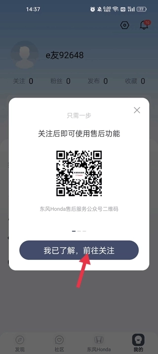 3、点击允许并进入微信,扫码关注东风honda售后服务公众号,随后返回绑定微信页面,点击允许进入;