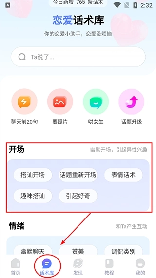 3、要是想和心仪的对象开启聊天,也能在【话术库】中点击【开场】,让你们的聊天轻松有趣不冷场!