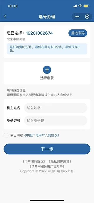 3、选择套餐,并输入相关信息,最后根据页面提示进行下一步操作