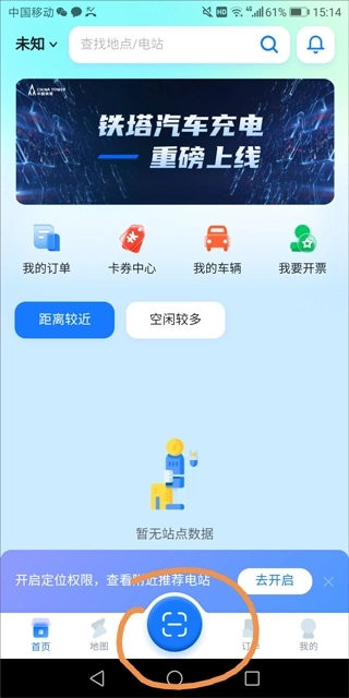 1、打开铁塔汽车充电app,点击底部中间的扫码按钮