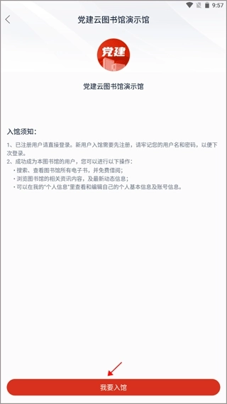 2、了解了入馆须知,点击下方按钮“我要入馆”。
