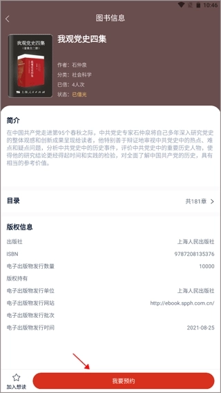 3、查看了书籍的简介和目录,以及版权信息,最后点击“我要预约”。