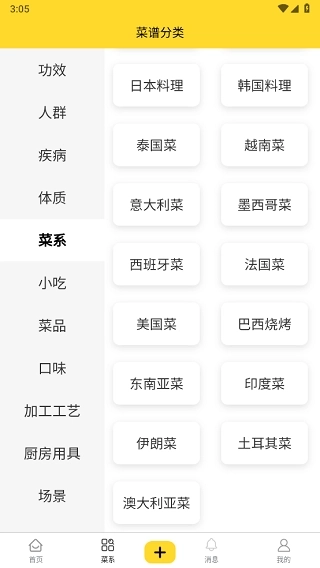 菜系分类涵盖全球范围的各类菜系,像中国的八大菜系、日韩料理、墨西哥菜以及泰国菜等都包含在内。