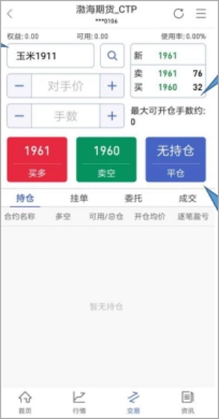 3、自己的添加的合约可以通过代码搜索或从自选中导入进行交易,导入后在下方持仓页面中显示,点击其中任意合约即可显示行情、反手与平仓操作
