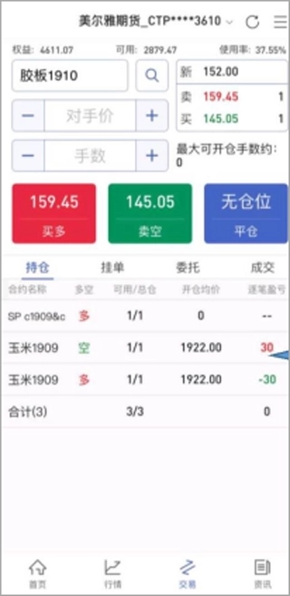 2、下单为三键下单方式。交易支持主力合约下单,合约无持仓时,显示买(开)、卖(开)、平。 根据合约持仓情况,显示:加多、加空、锁仓、平。
