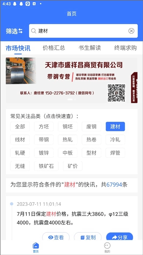 在市场快讯板块,您能迅速获取钢坯、方坯、废钢及建材的最新资讯;价格汇总板块则整合了各地市场动态,助力您精准把握价格走向,从而更妥善地制定应对策略。总而言之,所有与钢材相关的建材信息和价格,我们都能为您处理妥当。每日实时更新的数据反馈,便于用户及时做出判断;若您有采购或销售需求,还可通过终端发布供需资源,搭建与全国钢材从业者的合作桥梁。
