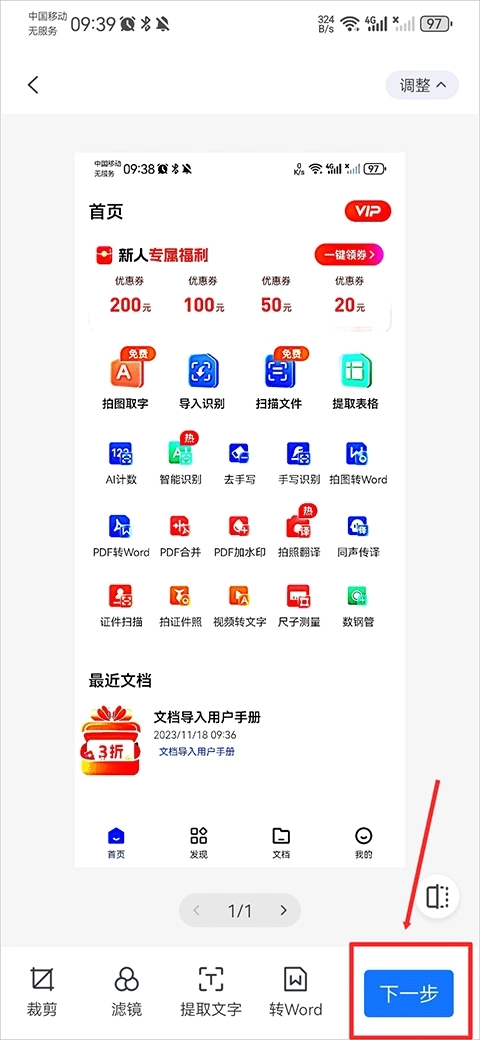 3、拍照或导入文件后,你还可以对文件进行剪裁、添加滤镜等操作,完成后点击下一步