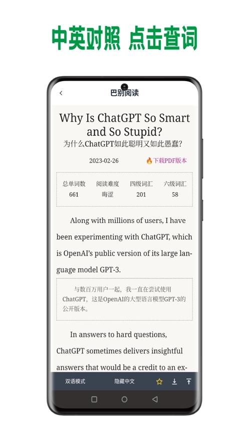 巴别阅读是一款相当不错的电子书应用,专为广大英语爱好者打造。平台上汇聚了海量英语读物与丰富的英语文章,用户能借助在线阅读的形式,逐步提升自身的词汇储备与阅读理解水平,而且还会持续推送更多优质的英语文章。
