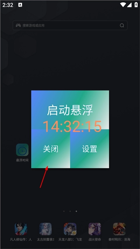 2、在启动悬浮页面中有设置和关闭两个选项,用户点击关闭即可关掉悬浮时间。