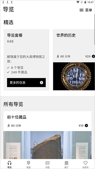 聆听大英博物馆官方导览App里250件馆藏精品的音频赏析。最新的研究成果会让您以崭新的视角观看展品。 除了丰富的音频资源,App还为许多展品提供背景图、策展人视频解说等多媒体信息内容。