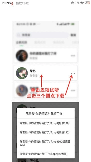 2、可以直接点击歌曲旁边的三个圆点,就可以选择不同的品质
