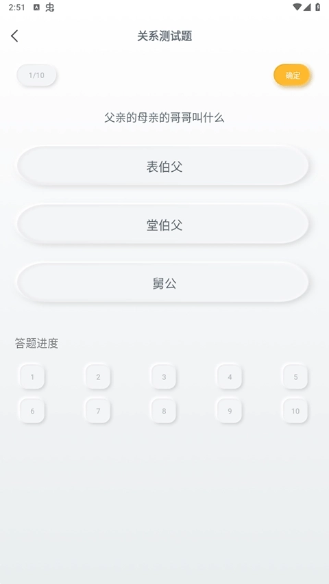 此外,亲戚称呼计算器app还设有专门的测试题目来检验你,能让你刚巩固的知识记得更牢,在日常生活中也绝对用得上,对这方面有困惑的用户赶紧来下载吧。