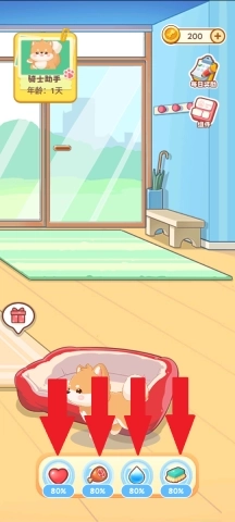 4、进入游戏与它互动,为它喂食、饮水、清理